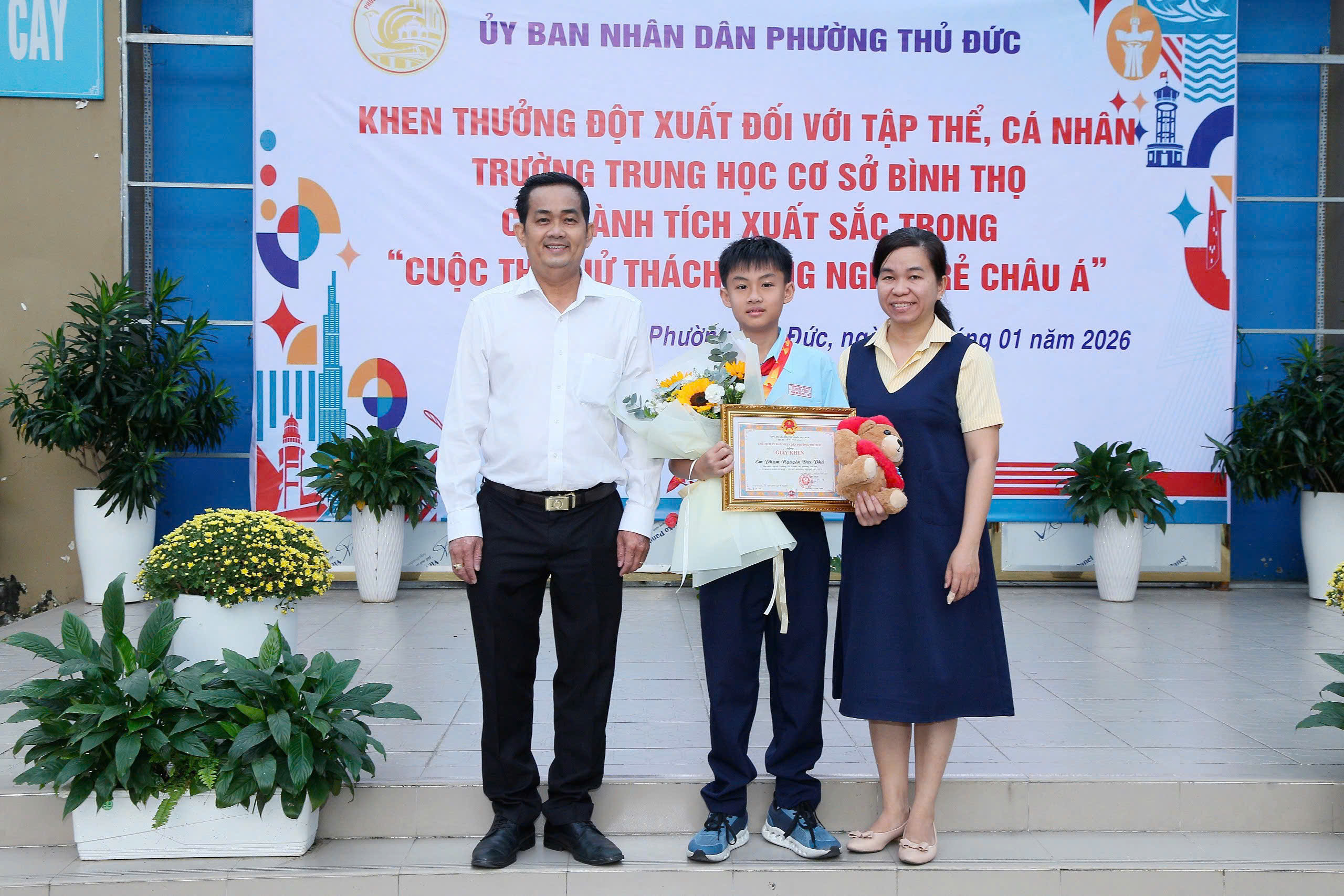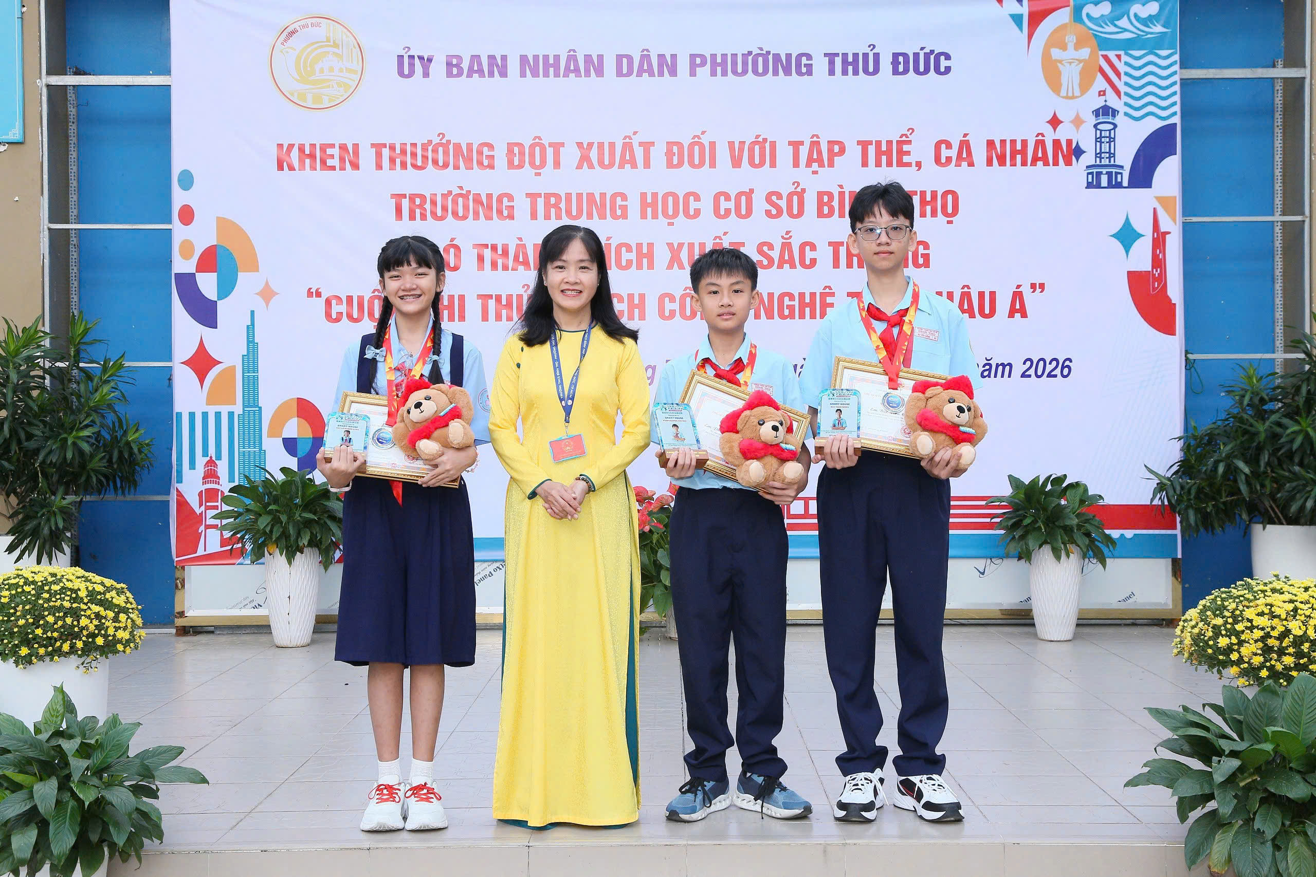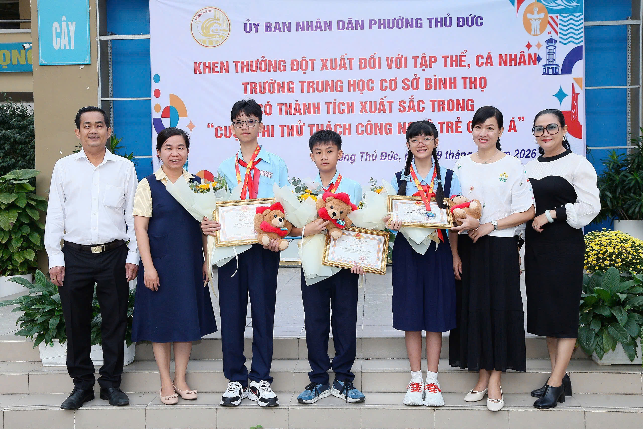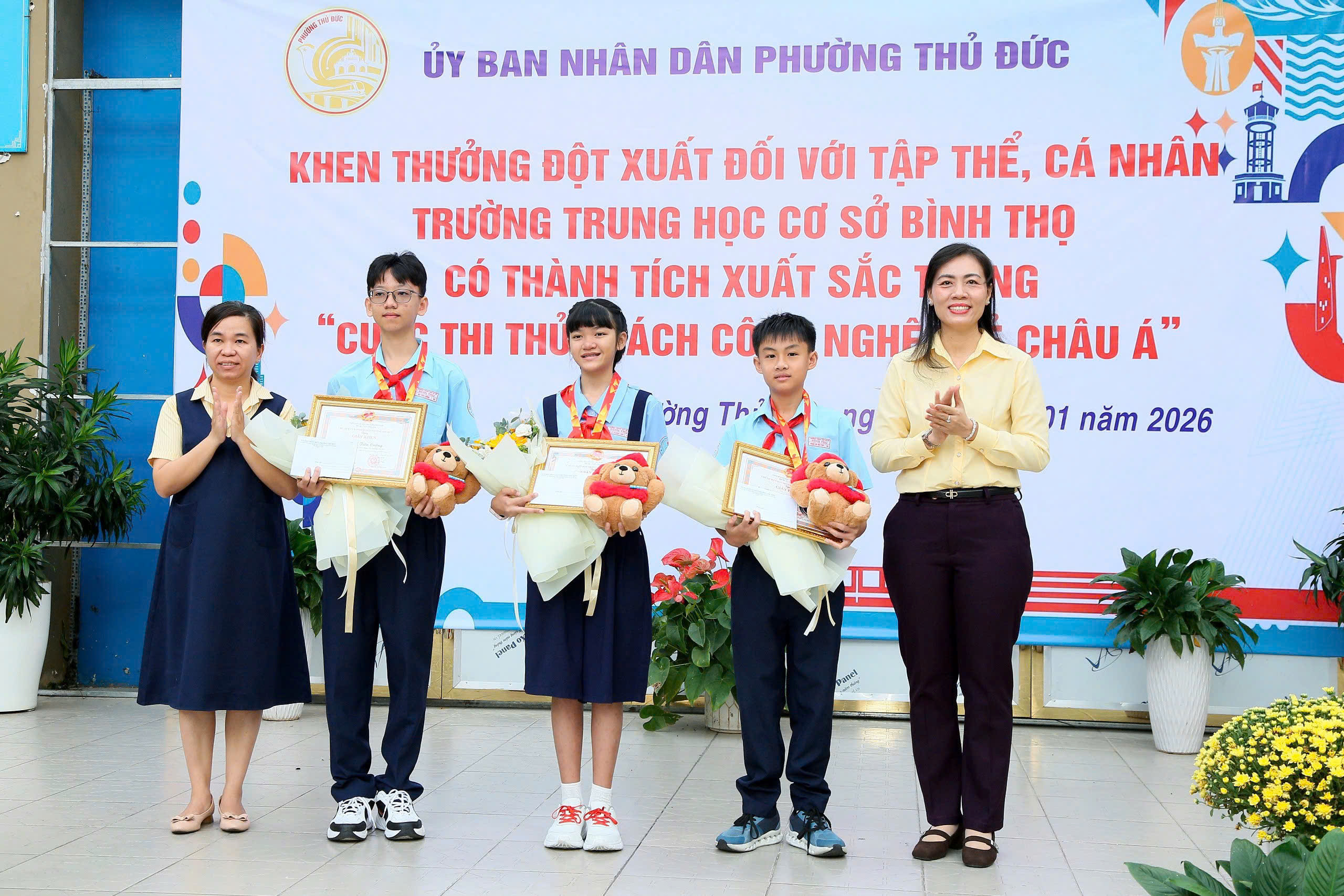 Tại buổi lễ, Ủy ban nhân dân phường Thủ Đức đã công bố và trao Quyết định khen thưởng cho tập thể Trường THCS Bình Thọ nhằm biểu dương, ghi nhận những nỗ lực và thành tích nổi bật của nhà trường trong phong trào nghiên cứu khoa học, đổi mới sáng tạo tại Hội thi Quốc tế. Đồng thời, các em học sinh Phạm Nguyễn Đức Phú (lớp 6/6), Mai Lê Khánh Linh (lớp 6/3) và Bùi Tiến Cường (lớp 8/5) cũng được tuyên dương, khen thưởng vì tinh thần học tập nghiêm túc, sáng tạo, góp phần lan tỏa hình ảnh học sinh Việt Nam năng động, tự tin hội nhập quốc tế.