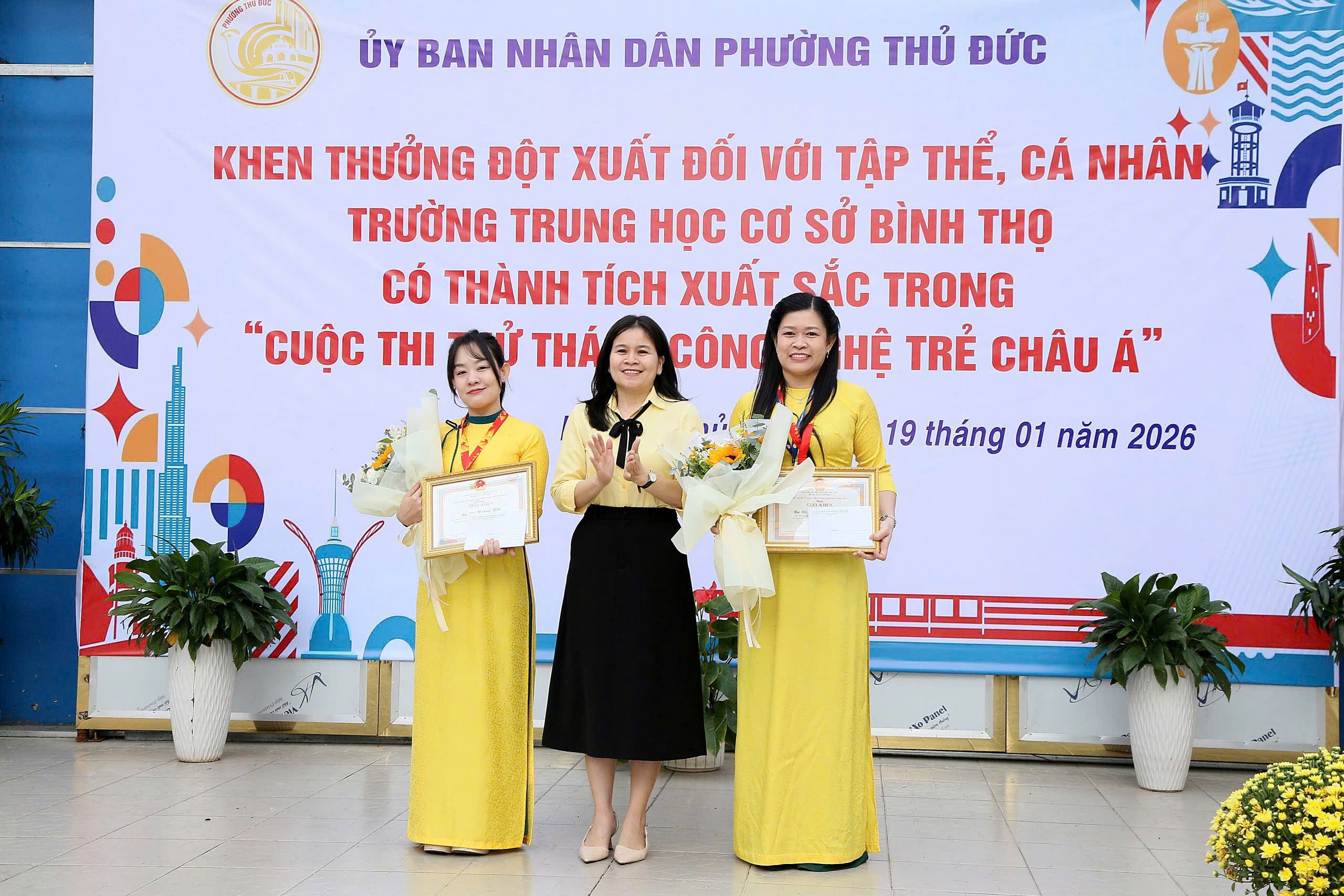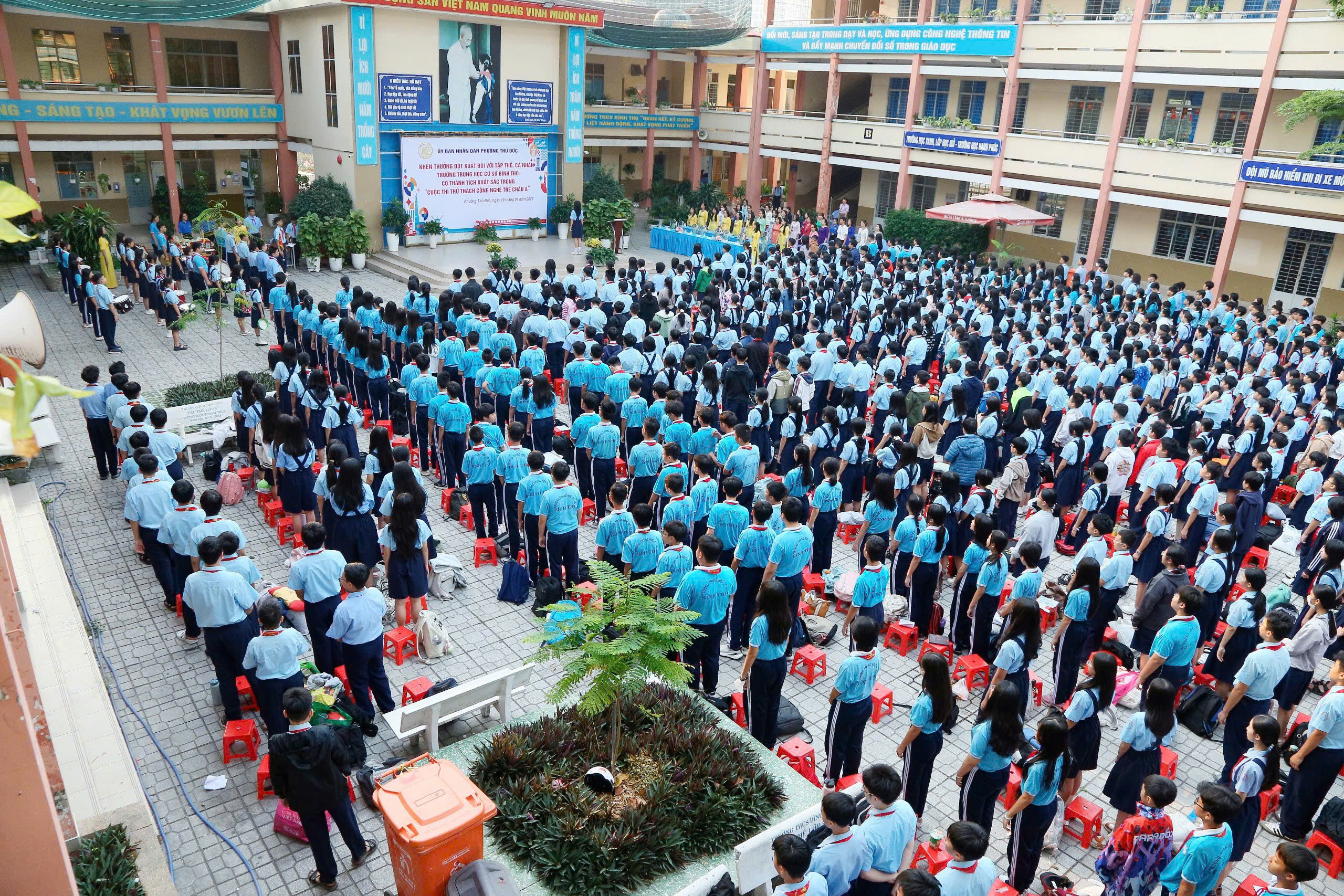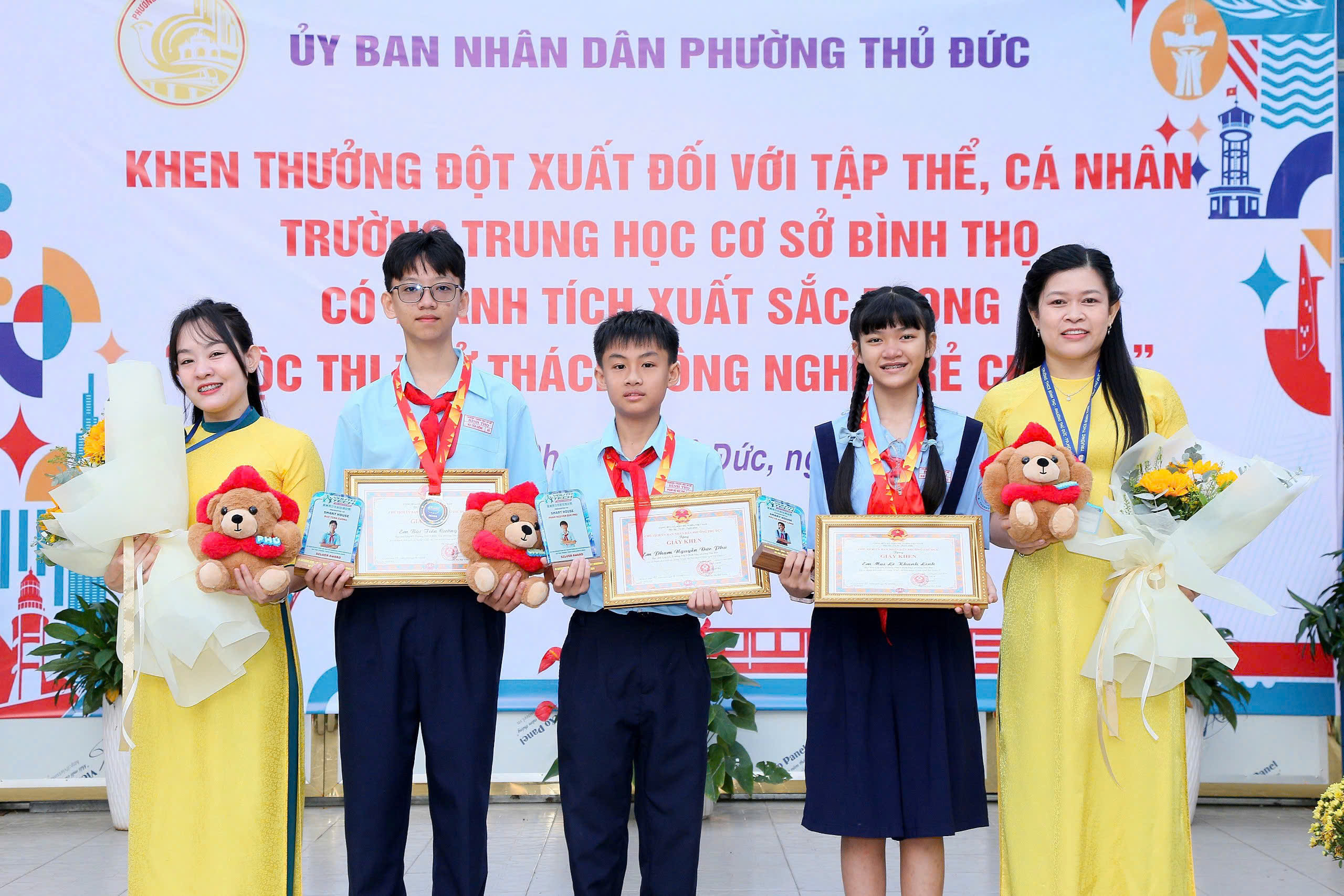 Tại buổi lễ, Ủy ban nhân dân phường Thủ Đức đã công bố và trao Quyết định khen thưởng cho tập thể Trường THCS Bình Thọ nhằm biểu dương, ghi nhận những nỗ lực và thành tích nổi bật của nhà trường trong phong trào nghiên cứu khoa học, đổi mới sáng tạo tại Hội thi Quốc tế. Đồng thời, các em học sinh Phạm Nguyễn Đức Phú (lớp 6/6), Mai Lê Khánh Linh (lớp 6/3) và Bùi Tiến Cường (lớp 8/5) cũng được tuyên dương, khen thưởng vì tinh thần học tập nghiêm túc, sáng tạo, góp phần lan tỏa hình ảnh học sinh Việt Nam năng động, tự tin hội nhập quốc tế.
