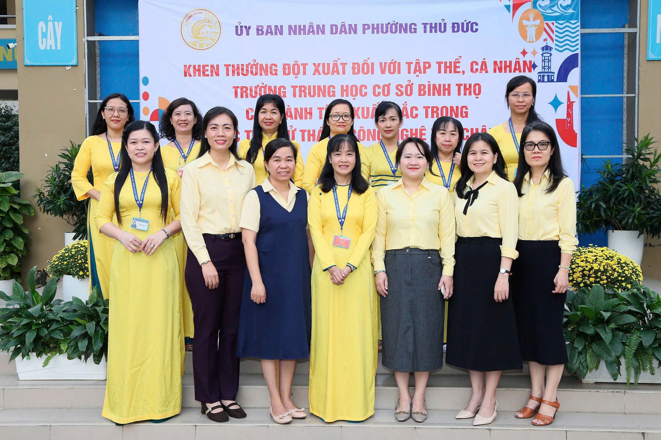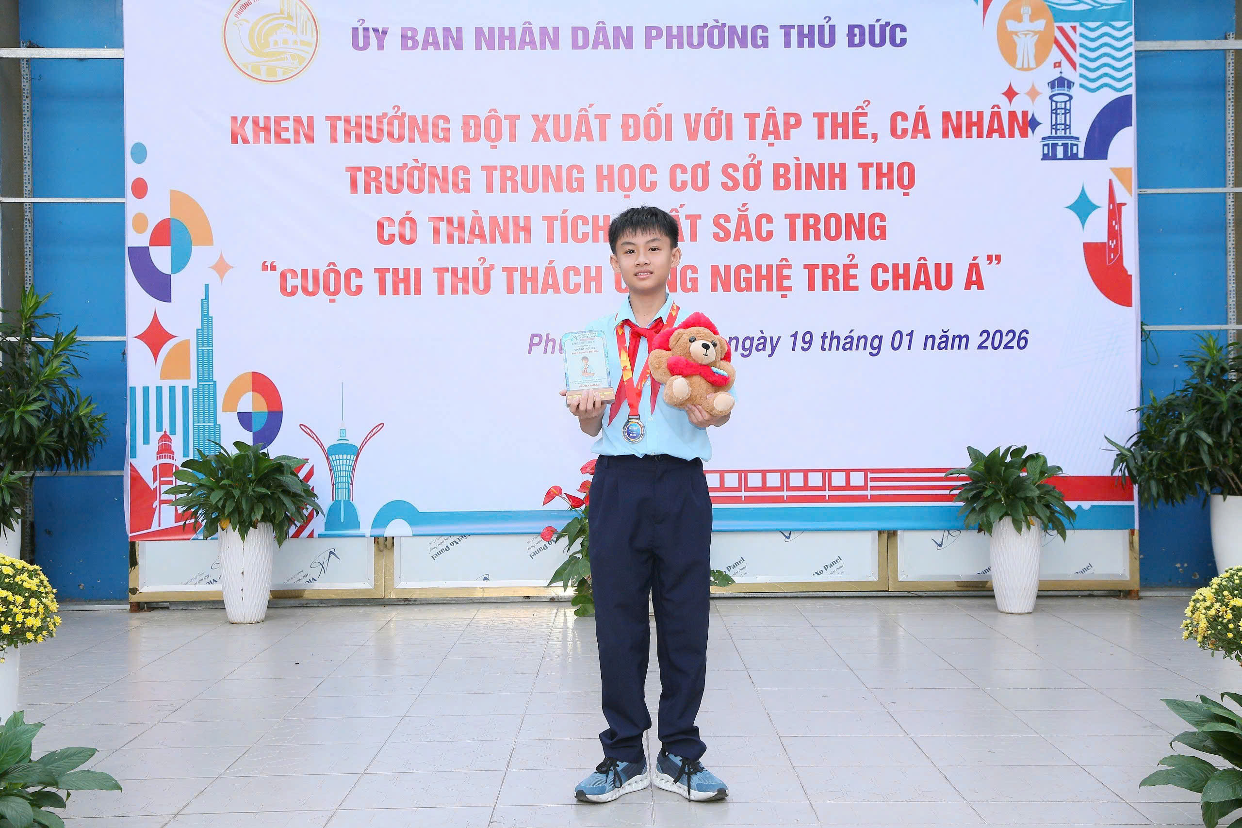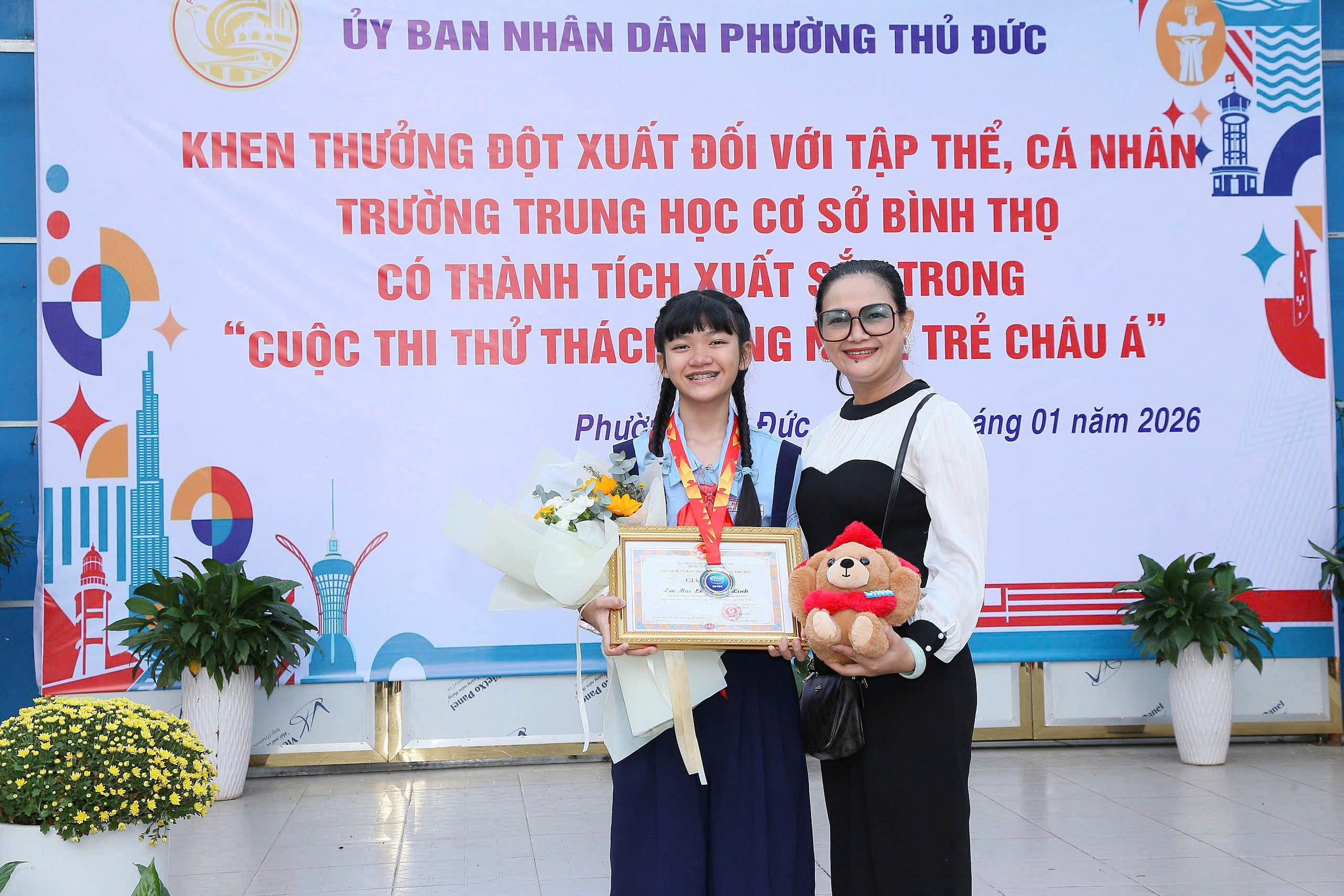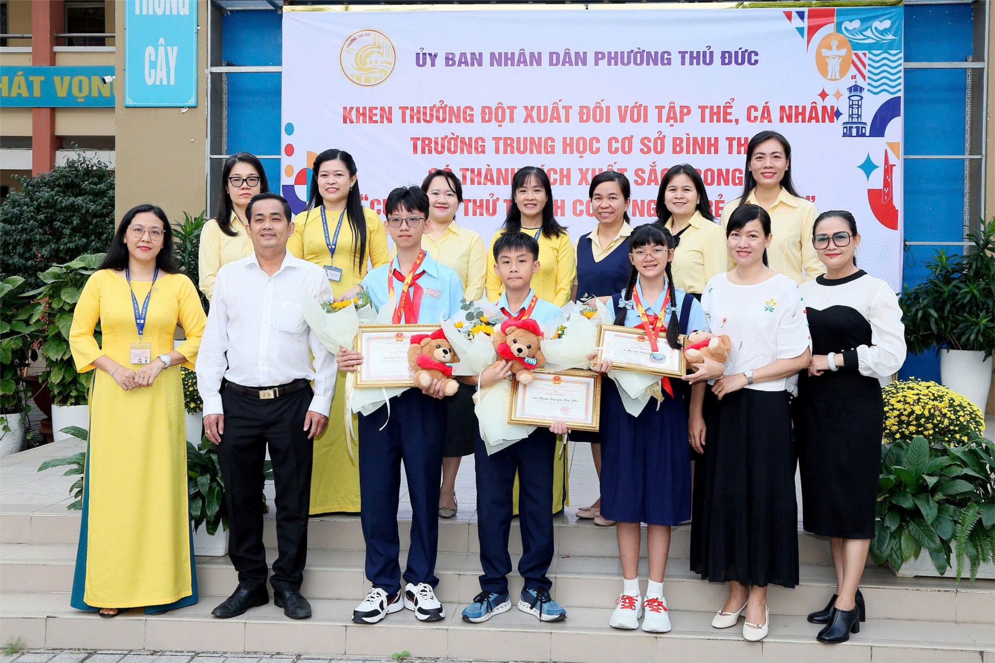 Tại buổi lễ, Ủy ban nhân dân phường Thủ Đức đã công bố và trao Quyết định khen thưởng cho tập thể Trường THCS Bình Thọ nhằm biểu dương, ghi nhận những nỗ lực và thành tích nổi bật của nhà trường trong phong trào nghiên cứu khoa học, đổi mới sáng tạo tại Hội thi Quốc tế. Đồng thời, các em học sinh Phạm Nguyễn Đức Phú (lớp 6/6), Mai Lê Khánh Linh (lớp 6/3) và Bùi Tiến Cường (lớp 8/5) cũng được tuyên dương, khen thưởng vì tinh thần học tập nghiêm túc, sáng tạo, góp phần lan tỏa hình ảnh học sinh Việt Nam năng động, tự tin hội nhập quốc tế.