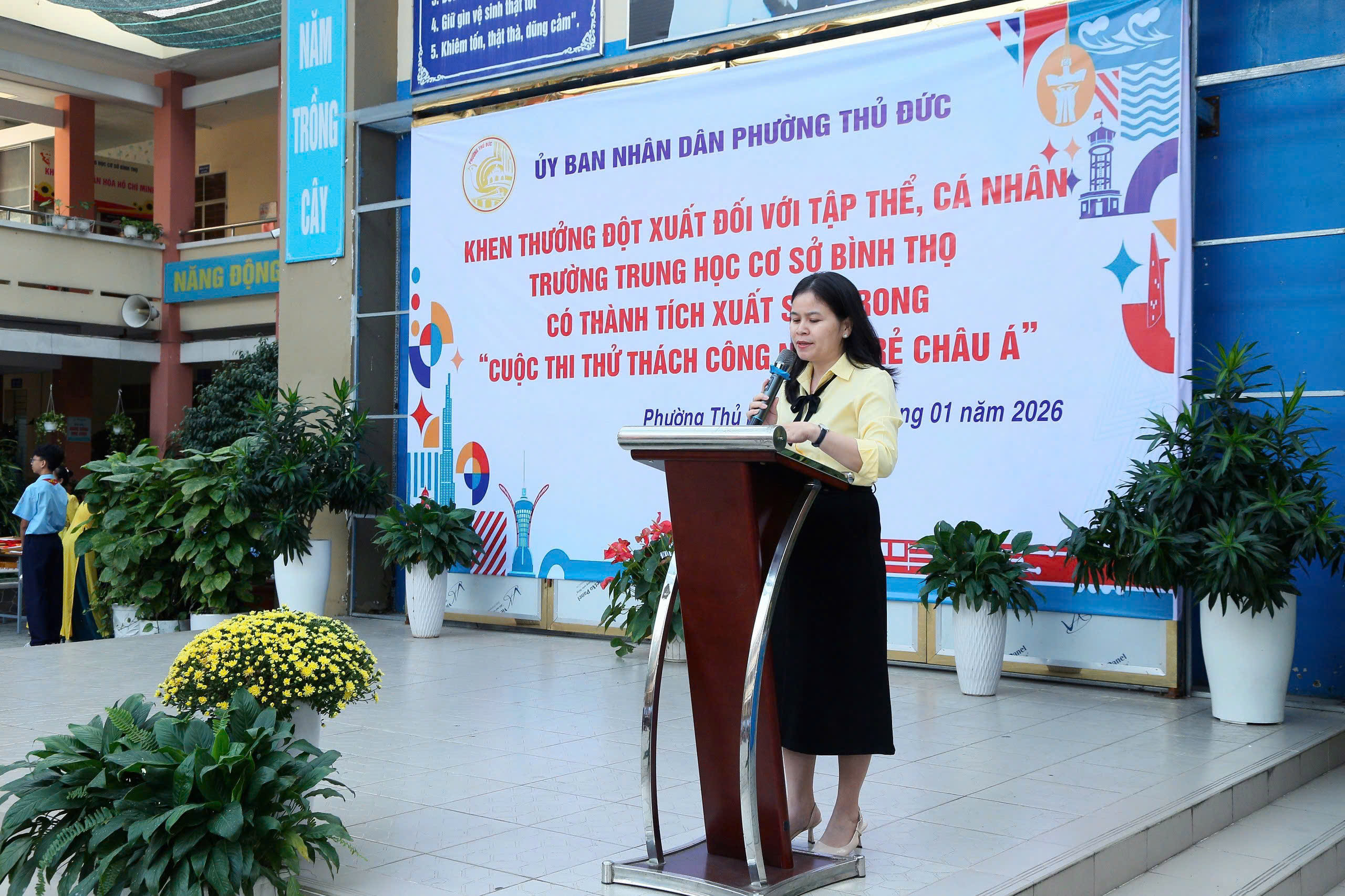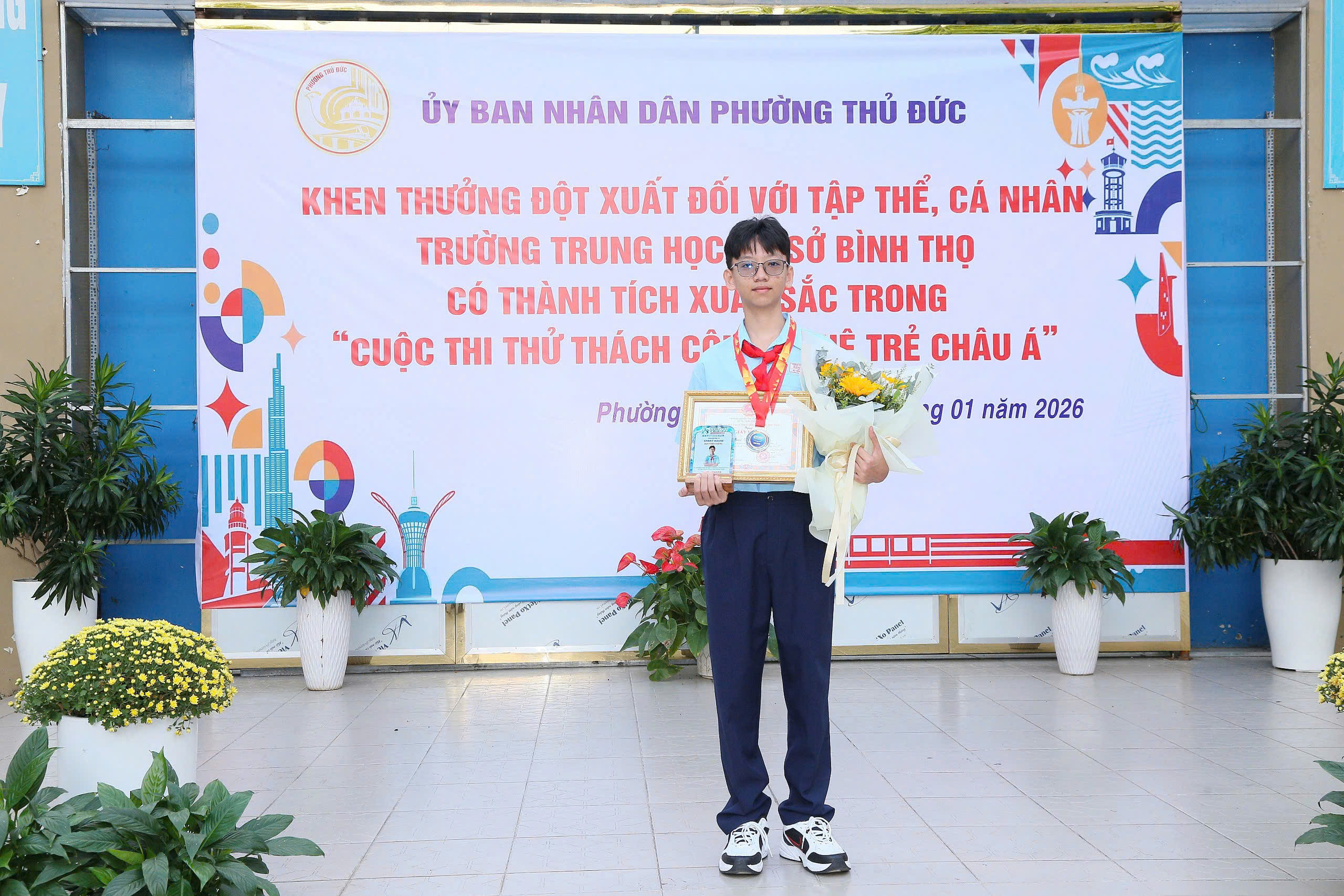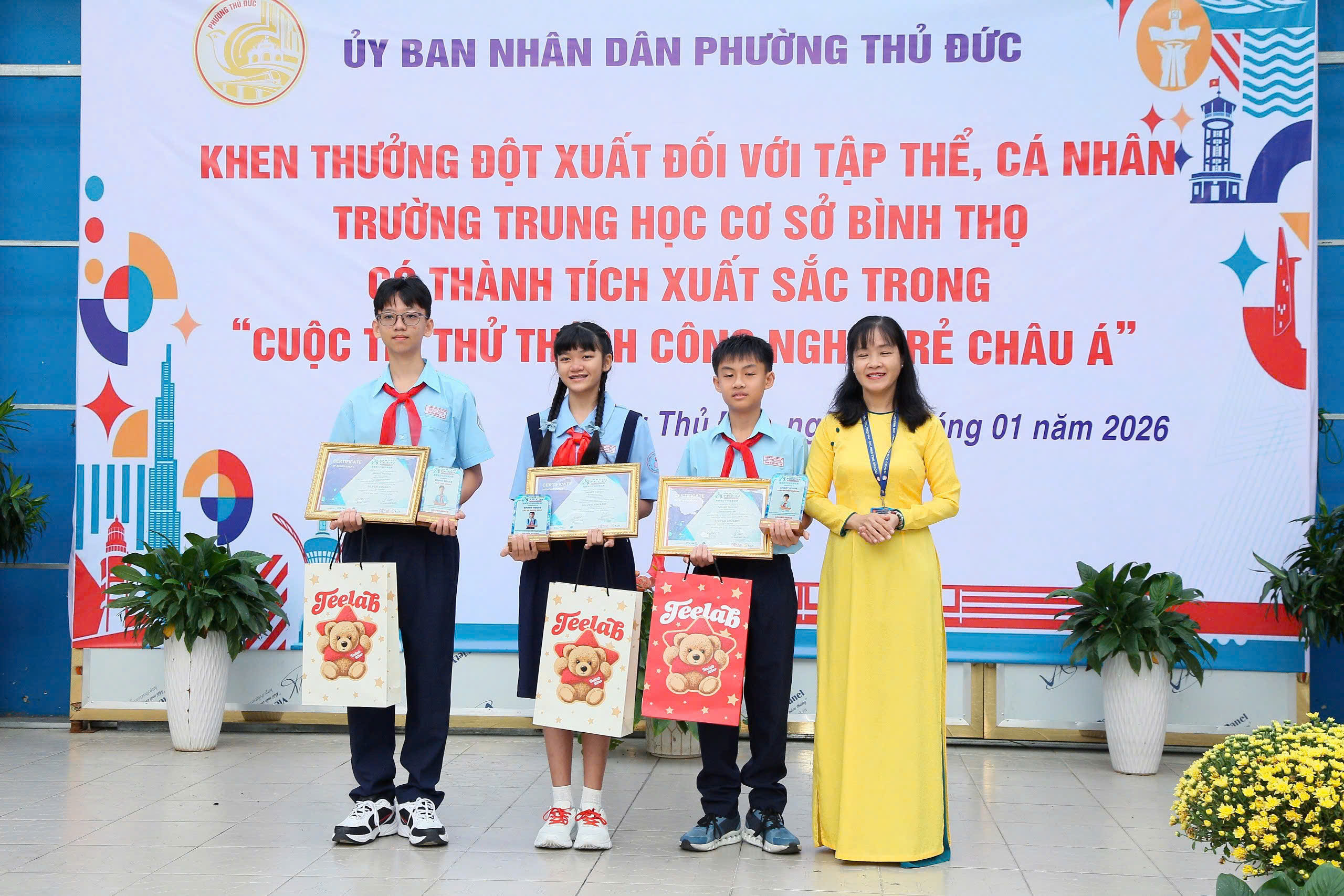 Nhằm ghi nhận, biểu dương những thành tích xuất sắc trong phong trào nghiên cứu khoa học, đổi mới sáng tạo của nhà trường, Ủy ban nhân dân phường Thủ Đức đã tổ chức buổi lễ khen thưởng các tập thể, cá nhân Trường THCS Bình Thọ đạt thành tích cao tại Hội thi Quốc tế Thử thách Sáng tạo trẻ – Youth Tech Asia Challenge 2026.